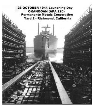 We do not have any original photos of the launching of our OKANOGAN, but the photos below capture the moment… close your eyes and imagine you are there 26 October 1944, Richmond, California…
