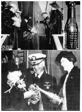 When OKANOGAN was launched 26 Oct 1944, the Navy assigned a sponsor, Mrs. E. J. Husted to smash a champagne bottle against the ship’s bow. A brief moment in time, a blast of the bubbly, and some broken glass….a cheer, and it’s history. But, not so fast!